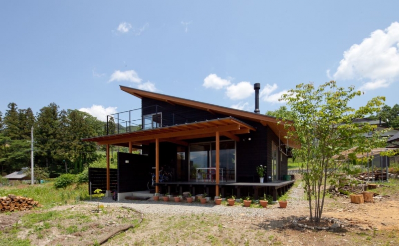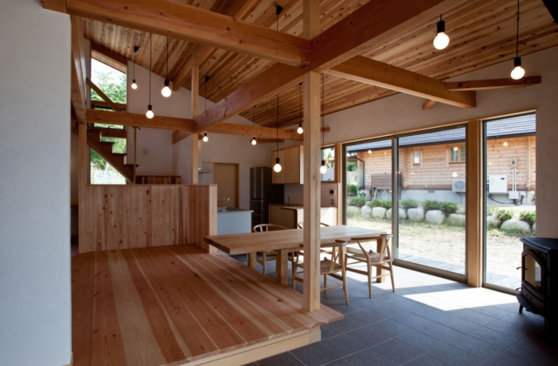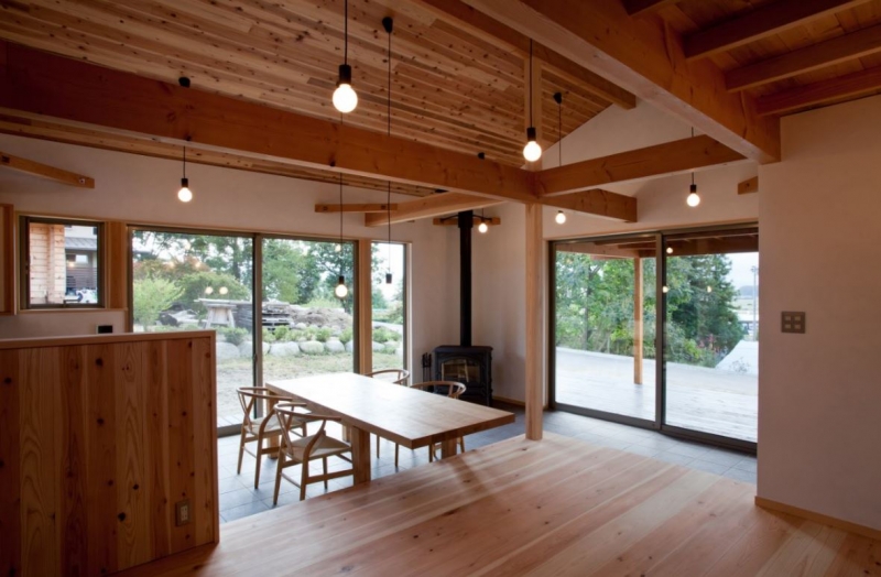 自然エネルギーを最大限に利用する開放的な建物です。アウトドア志向の施主のために玄関・食堂・台所をタイル貼りの土間とし土足でも自由に歩けるようにしました。この土間は太陽熱を蓄熱する効果が高くしかも薪ストーブの熱も蓄熱します。太陽光発電もしていますので光熱費ゼロの家になりました。