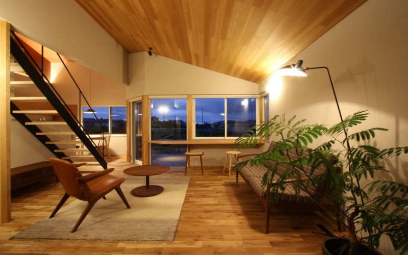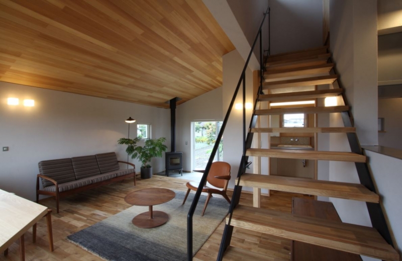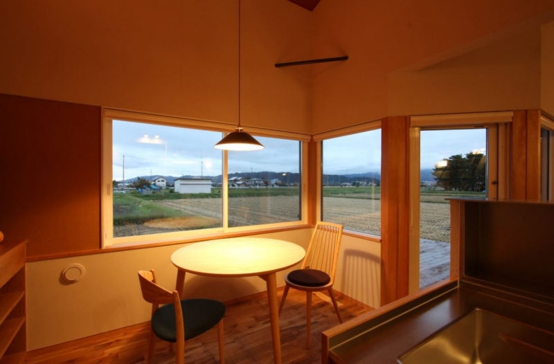 自然豊かな里山や田園風景を身近に感じる風景を取り込んだ住まいです。リビングに土間コーナーを設け薪ストーブに家族がつどい雪景色を見ながらゆったりとした時間を過ごします。キッチンや洗面化粧台は地元の家具工房で製作し断熱性能に優れた快適な住まいです。